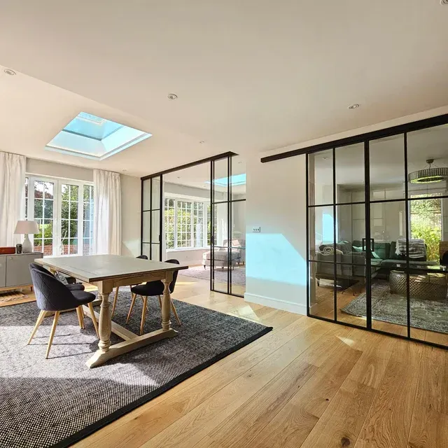 These internal glass doors are the ultimate design solution for a modern living room, expertly engineered to create a feeling of spacious, seamless living. They work by allowing natural light to flood the room and flow effortlessly into adjacent areas, crafting an open, bright, and calming atmosphere.